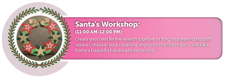 Create your own festive wreath together in this fun parent-child craft session. Unleash your creativity, enjoy the Christmas spirit, and take home a beautiful handmade decoration!
